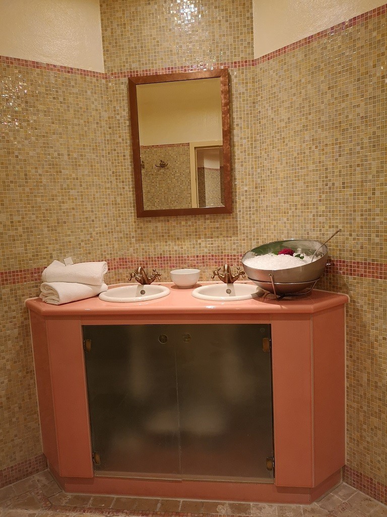 Zum Abend hin hatten wir eine Wellness-Verabredung. Meine Schwester in Kleopatras Höhle für ein Rosenblütenbad und ich im rosa gekachelten Raum für mein Schlammbad.